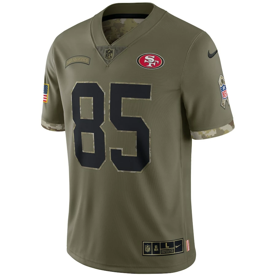 Honor our service members while supporting the San Francisco 49ers with this 2022 Salute To Service George Kittle Limited Jersey. This Nike gear features a military-inspired color scheme, complete with an American flag and Salute To Service ribbon appliqué on the right sleeve. The crisp San Francisco 49ers graphics and camouflage details will add some much-needed spirit to your game day collection. The NFL does not profit from the sale of Salute to Service products. Charitable contributions are awarded by the NFL Foundation to the NFL’s military nonprofit partners. For more information, please visit www.NFL.com/causes/salute.